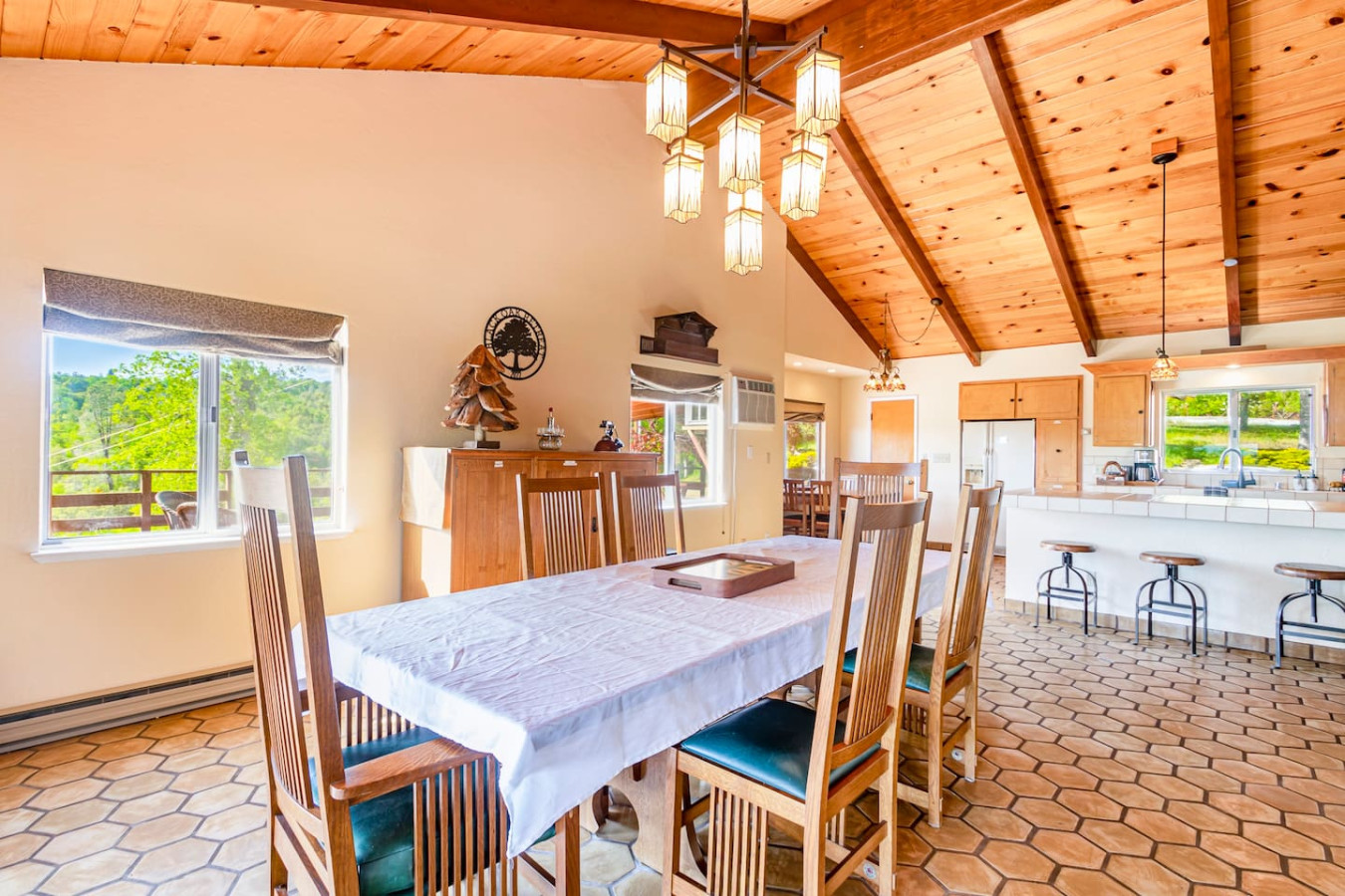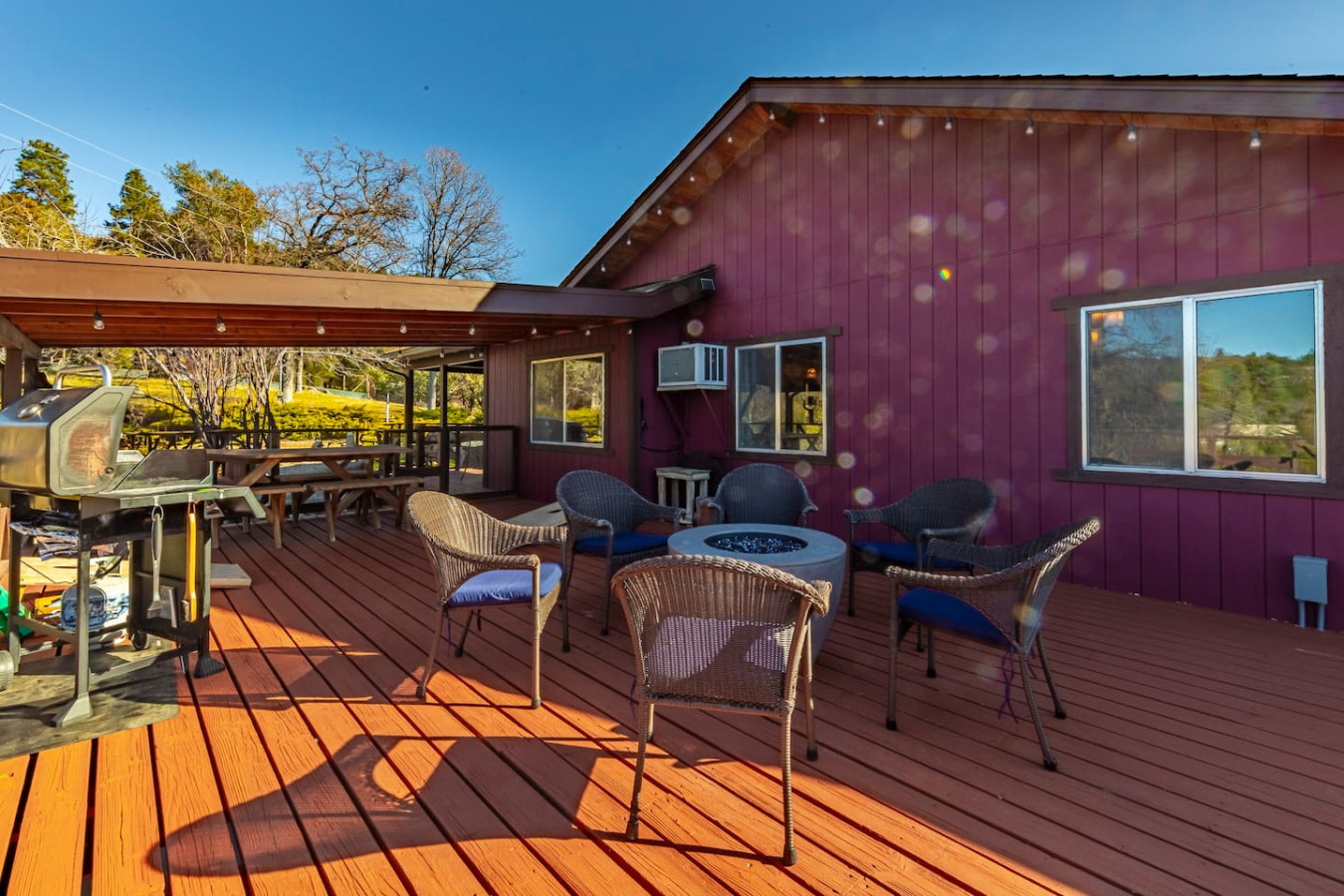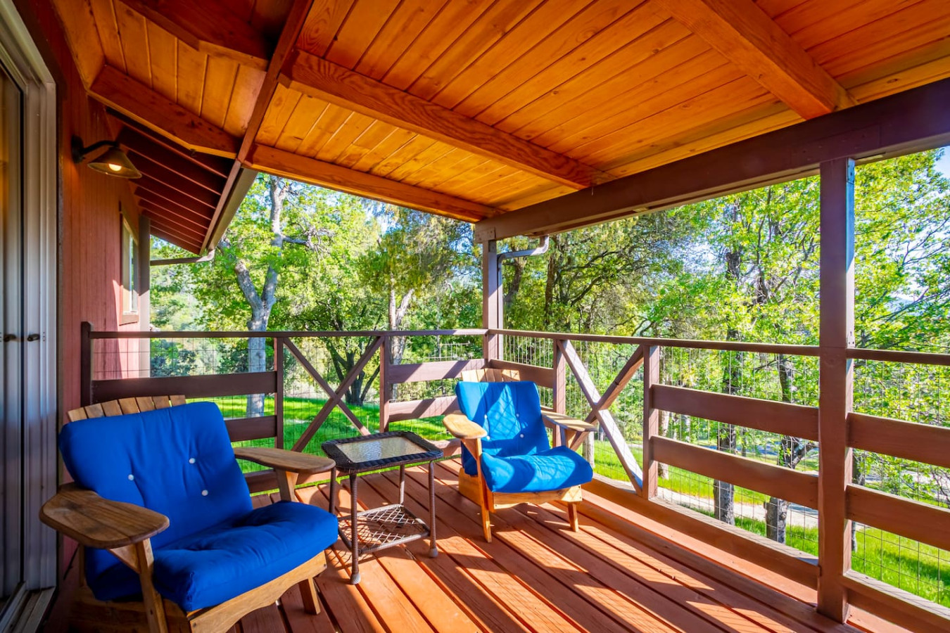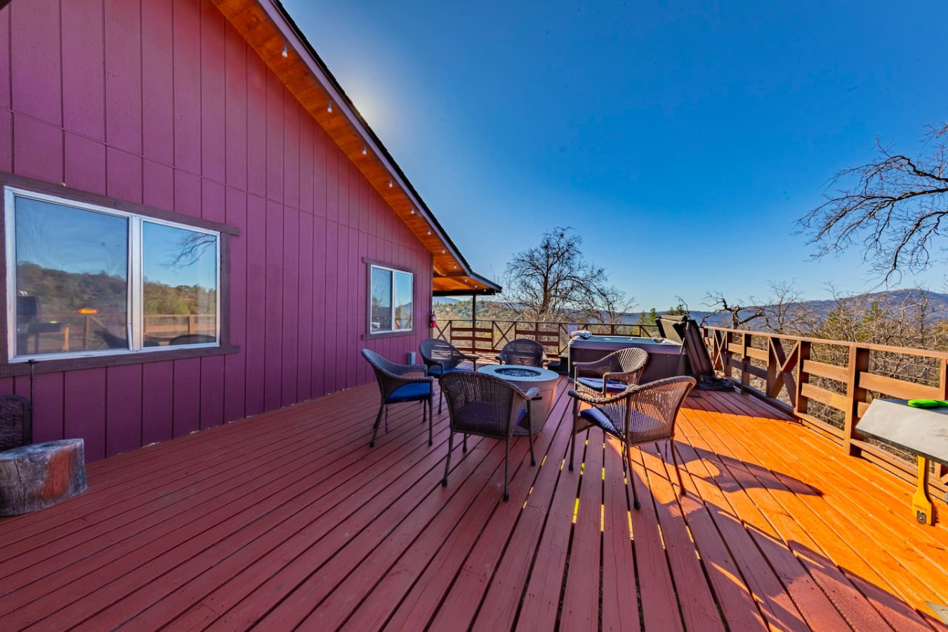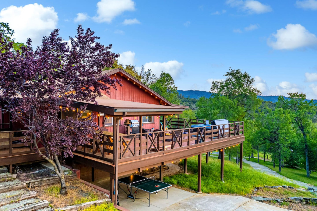 Step into adventure at our secluded mountain vila ideal for family of six. This private hillside haven, is all over the same floor, offers 2 Bedrooms with attached bathrooms, a hot tub, EV Charger, BBQ Grill, Fire pit, and a mesmerizing sunset vista. 10 min to Bass Lake, and a thrilling 20-minute journey to Yosemite South Gate. Unit downstairs is separate, with 2 more bedrooms, one with attached full bathroom as well as entertainment room. You may add a-la-carte via guest portal after booking. LIVING SPACE The interior features 1600 sq ft of Living area, an open floor plan with high ceilings, custom lighting, a phenomenally beautiful kitchen with pantry and bar top, a freestanding wood stove fireplace, and big sliding doors opening up to covered porches from upstairs living room both looking over a park like setting with manzanitas, cedars, and oaks, and plenty of forest land with wildlife galore. AMENITIES: The 2 Full bedroom, with 2 Full attached bath. Features Carport with parking and EV Charger, a patio and view to die for, an outdoor ping pong table that is climate proof, a Hot tub on the upstairs open deck under the stars with the magnificent view of Sierra all around, BBQ Grill, Propane fire-pit and 4 different seating areas. PARKING Once you enter the Driveway, stay on the right to park by the Carport and the area marked as Upstairs parking area. HIP CAMP Hip Camp Site offers separate reservation and features a separate driveway down to the left as soon as you enter the main Driveway from the Jean Road. All Areas except Owner's closet (Shed) and Cleaner's closets (Downstairs, keypad door) We are available whenever needed by guests, within minutes. office is located at Oakhurst Plaza, besides the Yosemite Visitor Center. 2-Story Villa stands in the middle of 10 acres of Cedars and Pines. With wrap around deck, and a Hip Camp for adventure! Now with 3 full bathrooms, each of the 4 bedrooms have attached bathroom and doors for privacy. 4th bedroom includes entertainment room with locked doors on either side. With double-yellow line paved roads all the way to the driveway, this Beautiful private and peaceful home sitting atop 10 gorgeous acres will be your winter and summer destination, with views of the mountains, the sunsets and abundant wildlife. OUTDOOR ACTIVITIES Connect with nature on a walk along the hiking trails that take you down to twin creeks on on side and up to forest grove at the other side, with seating provided at both the places. Watch animals all around the orchard and creeks taking a sip at the water holes. Jean Rd undoubtedly has one of the best views and the bigger ranch-houses in the Oakhurst Valley, The house is a Private mountain home located at 3100 ft over sea level, atop a hill in a rural location. You will need a car to get around. About 8 minute drive to restaurants and shopping. Great roads will take you all the way to the driveway. Road is maintained by county year-long. All-wheel drive is recommended during winter as this house enjoys fair amount of snow.