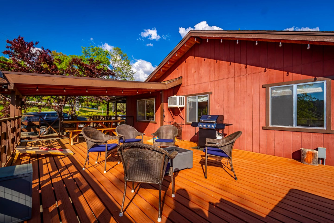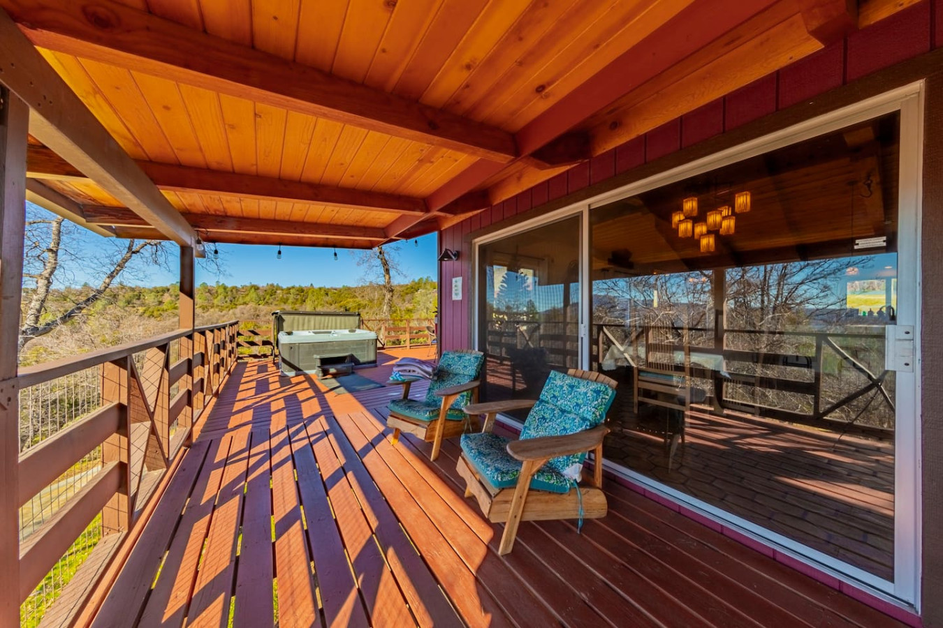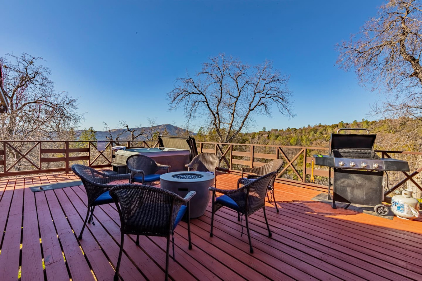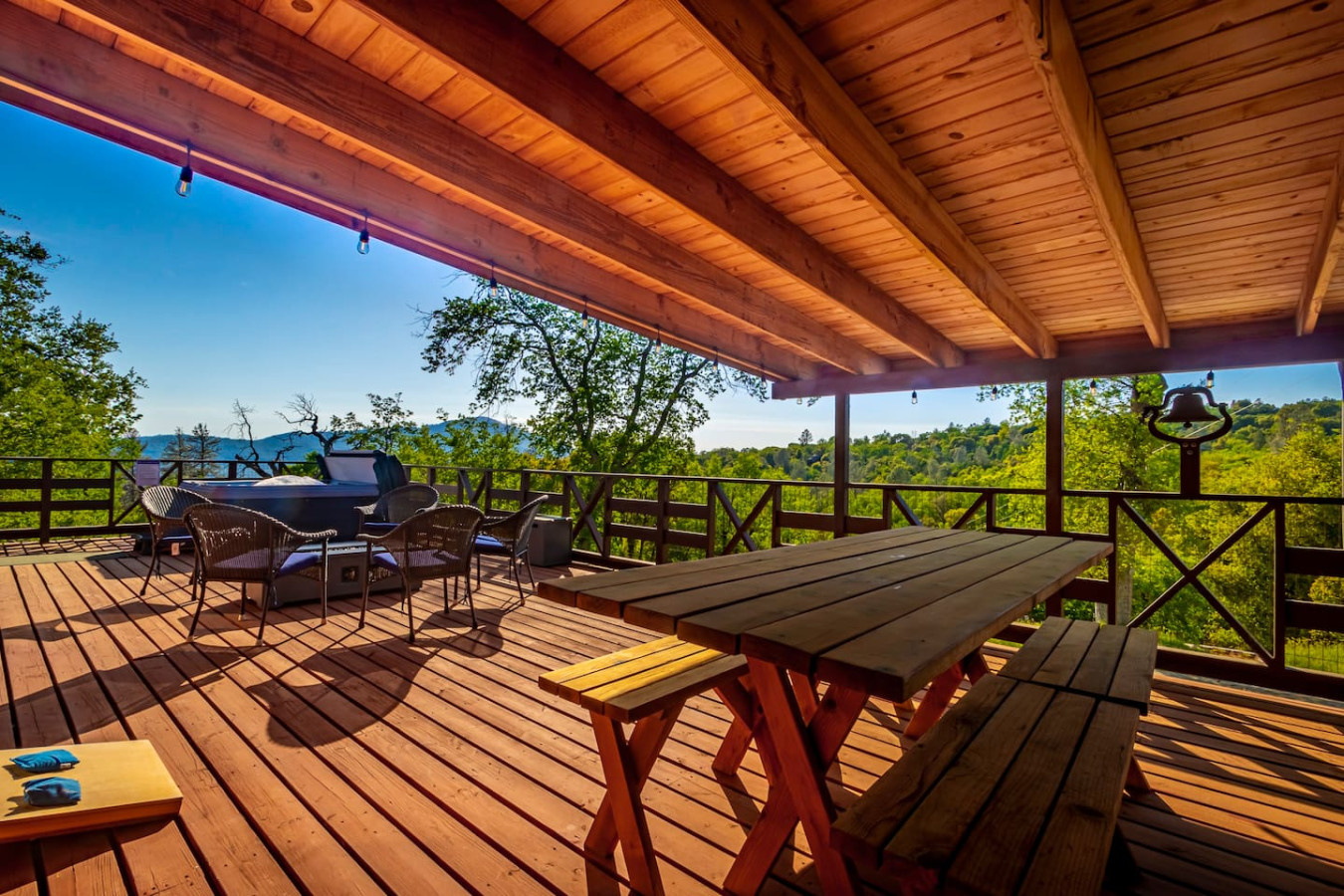 Step into adventure at our secluded mountain vila ideal for family of six. This private hillside haven, is all over the same floor, offers 2 Bedrooms with attached bathrooms, a hot tub, EV Charger, BBQ Grill, Fire pit, and a mesmerizing sunset vista. 10 min to Bass Lake, and a thrilling 20-minute journey to Yosemite South Gate. Unit downstairs is separate, with 2 more bedrooms, one with attached full bathroom as well as entertainment room. You may add a-la-carte via guest portal after booking. LIVING SPACE The interior features 1600 sq ft of Living area, an open floor plan with high ceilings, custom lighting, a phenomenally beautiful kitchen with pantry and bar top, a freestanding wood stove fireplace, and big sliding doors opening up to covered porches from upstairs living room both looking over a park like setting with manzanitas, cedars, and oaks, and plenty of forest land with wildlife galore. AMENITIES: The 2 Full bedroom, with 2 Full attached bath. Features Carport with parking and EV Charger, a patio and view to die for, an outdoor ping pong table that is climate proof, a Hot tub on the upstairs open deck under the stars with the magnificent view of Sierra all around, BBQ Grill, Propane fire-pit and 4 different seating areas. PARKING Once you enter the Driveway, stay on the right to park by the Carport and the area marked as Upstairs parking area. HIP CAMP Hip Camp Site offers separate reservation and features a separate driveway down to the left as soon as you enter the main Driveway from the Jean Road. All Areas except Owner's closet (Shed) and Cleaner's closets (Downstairs, keypad door) We are available whenever needed by guests, within minutes. office is located at Oakhurst Plaza, besides the Yosemite Visitor Center. 2-Story Villa stands in the middle of 10 acres of Cedars and Pines. With wrap around deck, and a Hip Camp for adventure! Now with 3 full bathrooms, each of the 4 bedrooms have attached bathroom and doors for privacy. 4th bedroom includes entertainment room with locked doors on either side. With double-yellow line paved roads all the way to the driveway, this Beautiful private and peaceful home sitting atop 10 gorgeous acres will be your winter and summer destination, with views of the mountains, the sunsets and abundant wildlife. OUTDOOR ACTIVITIES Connect with nature on a walk along the hiking trails that take you down to twin creeks on on side and up to forest grove at the other side, with seating provided at both the places. Watch animals all around the orchard and creeks taking a sip at the water holes. Jean Rd undoubtedly has one of the best views and the bigger ranch-houses in the Oakhurst Valley, The house is a Private mountain home located at 3100 ft over sea level, atop a hill in a rural location. You will need a car to get around. About 8 minute drive to restaurants and shopping. Great roads will take you all the way to the driveway. Road is maintained by county year-long. All-wheel drive is recommended during winter as this house enjoys fair amount of snow.