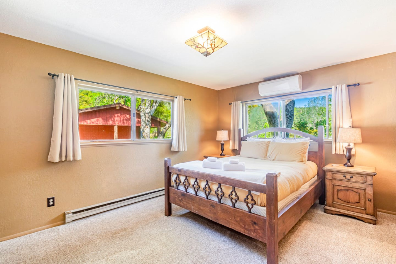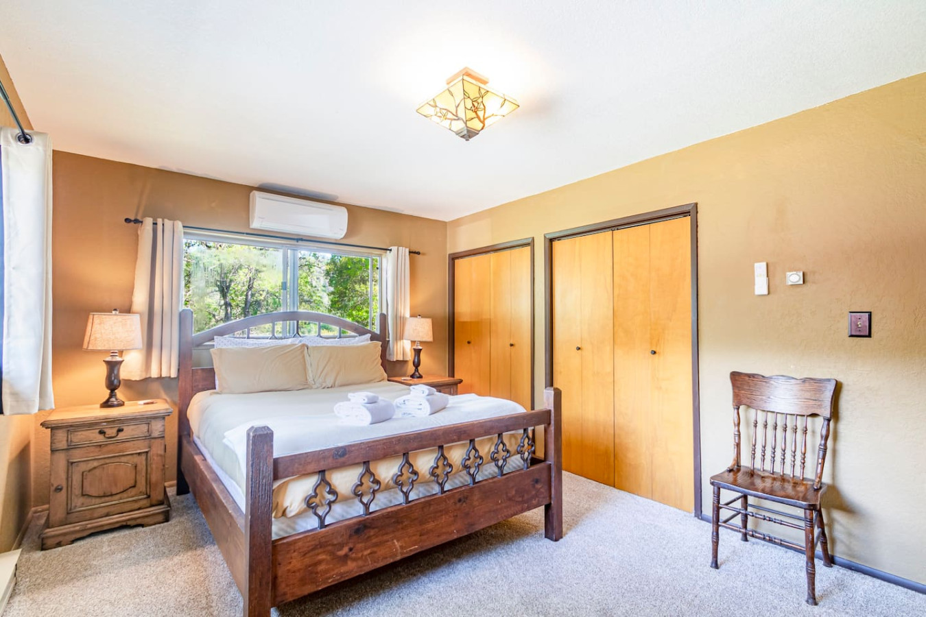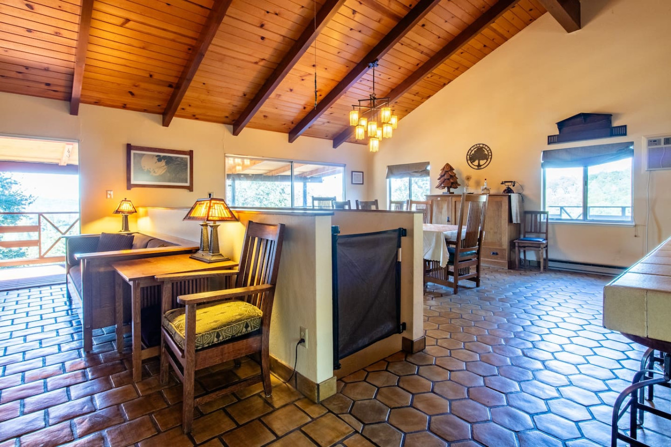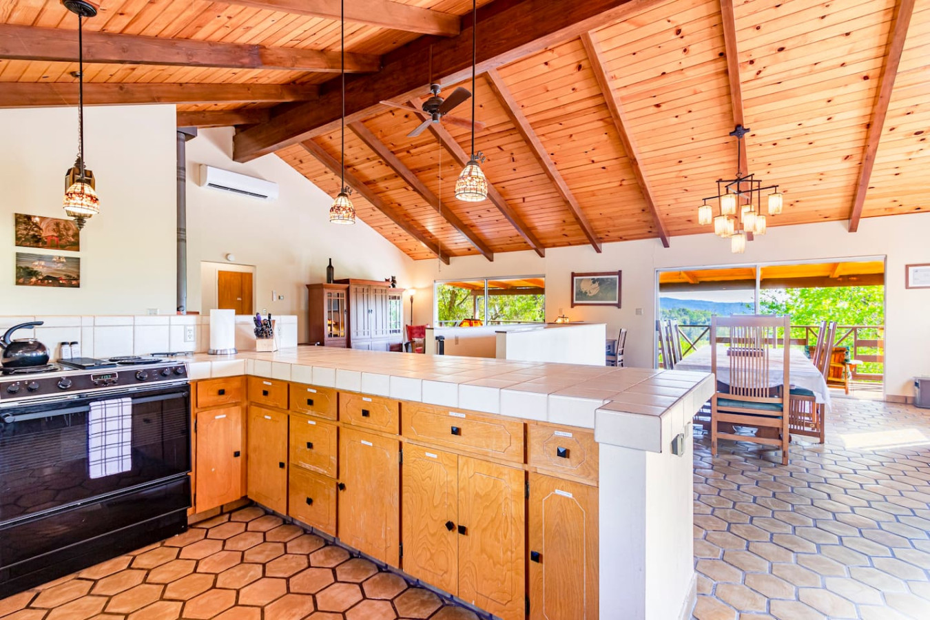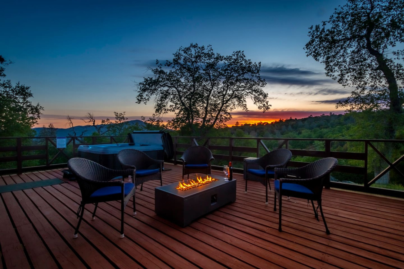 Step into adventure at our secluded mountain vila ideal for family of six. This private hillside haven, is all over the same floor, offers 2 Bedrooms with attached bathrooms, a hot tub, EV Charger, BBQ Grill, Fire pit, and a mesmerizing sunset vista. 10 min to Bass Lake, and a thrilling 20-minute journey to Yosemite South Gate. Unit downstairs is separate, with 2 more bedrooms, one with attached full bathroom as well as entertainment room. You may add a-la-carte via guest portal after booking. LIVING SPACE The interior features 1600 sq ft of Living area, an open floor plan with high ceilings, custom lighting, a phenomenally beautiful kitchen with pantry and bar top, a freestanding wood stove fireplace, and big sliding doors opening up to covered porches from upstairs living room both looking over a park like setting with manzanitas, cedars, and oaks, and plenty of forest land with wildlife galore. AMENITIES: The 2 Full bedroom, with 2 Full attached bath. Features Carport with parking and EV Charger, a patio and view to die for, an outdoor ping pong table that is climate proof, a Hot tub on the upstairs open deck under the stars with the magnificent view of Sierra all around, BBQ Grill, Propane fire-pit and 4 different seating areas. PARKING Once you enter the Driveway, stay on the right to park by the Carport and the area marked as Upstairs parking area. HIP CAMP Hip Camp Site offers separate reservation and features a separate driveway down to the left as soon as you enter the main Driveway from the Jean Road. All Areas except Owner's closet (Shed) and Cleaner's closets (Downstairs, keypad door) We are available whenever needed by guests, within minutes. office is located at Oakhurst Plaza, besides the Yosemite Visitor Center. 2-Story Villa stands in the middle of 10 acres of Cedars and Pines. With wrap around deck, and a Hip Camp for adventure! Now with 3 full bathrooms, each of the 4 bedrooms have attached bathroom and doors for privacy. 4th bedroom includes entertainment room with locked doors on either side. With double-yellow line paved roads all the way to the driveway, this Beautiful private and peaceful home sitting atop 10 gorgeous acres will be your winter and summer destination, with views of the mountains, the sunsets and abundant wildlife. OUTDOOR ACTIVITIES Connect with nature on a walk along the hiking trails that take you down to twin creeks on on side and up to forest grove at the other side, with seating provided at both the places. Watch animals all around the orchard and creeks taking a sip at the water holes. Jean Rd undoubtedly has one of the best views and the bigger ranch-houses in the Oakhurst Valley, The house is a Private mountain home located at 3100 ft over sea level, atop a hill in a rural location. You will need a car to get around. About 8 minute drive to restaurants and shopping. Great roads will take you all the way to the driveway. Road is maintained by county year-long. All-wheel drive is recommended during winter as this house enjoys fair amount of snow.