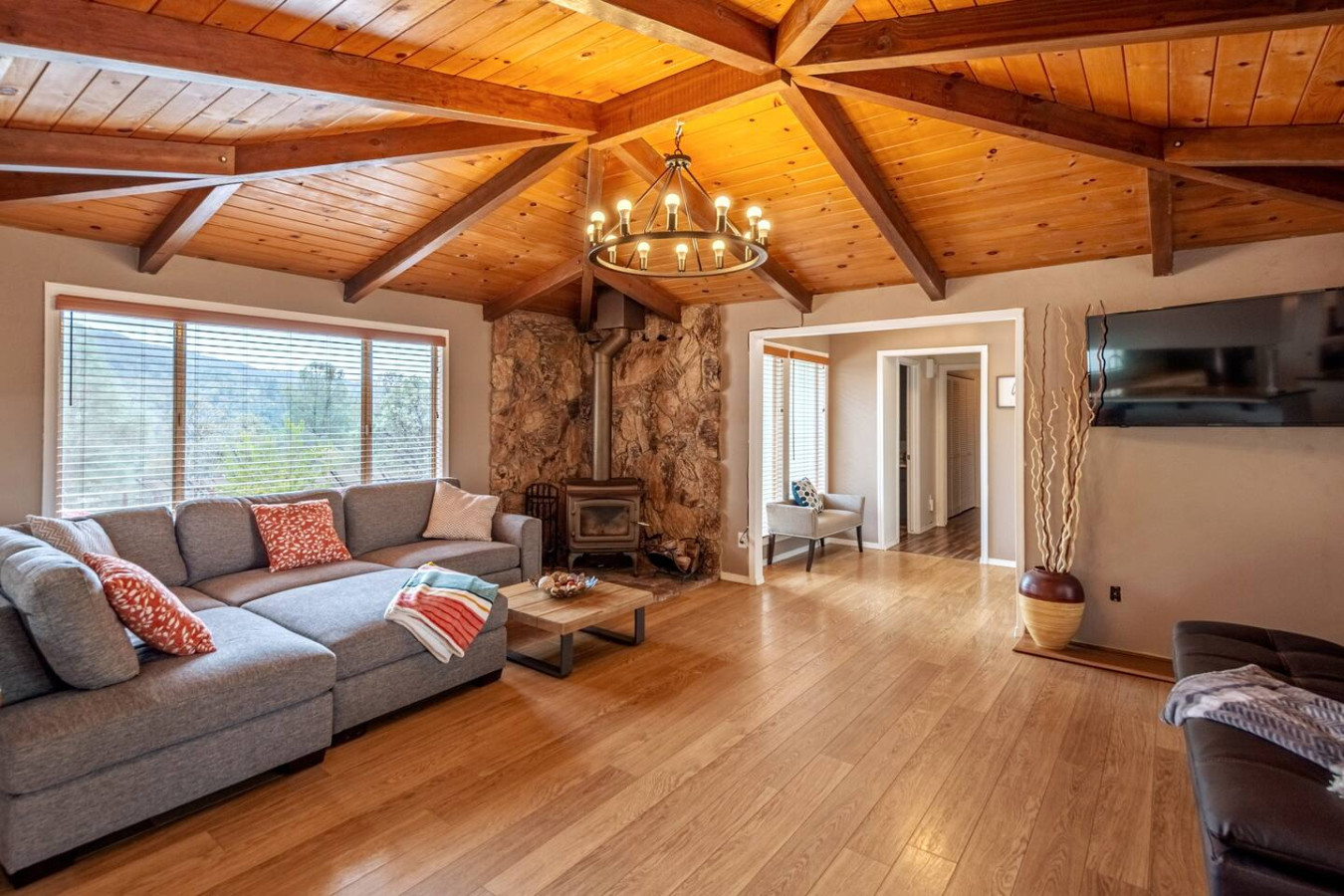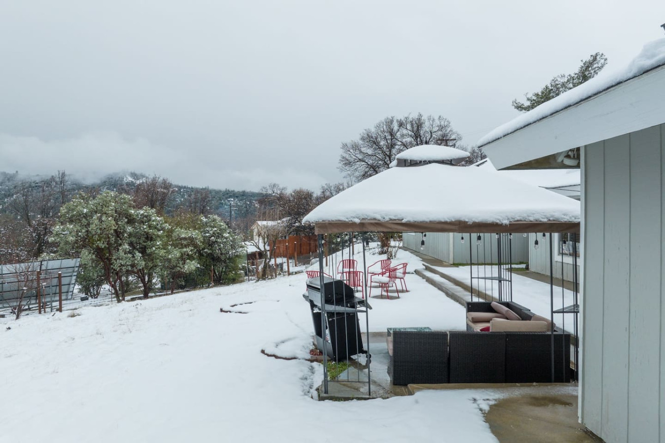 Newly listed at High Sierra Sky Ranch neighborhood at 3200 ft from sea level. Just 2 minutes off Highway 41, 8 min from Bass Lake, and only 15 minutes from Yosemite South Gate, the mountain home features a 360 degree view of mountains on either side of the house. Comes with a recently renovated game room filled with Ping Pong table, Foosball Table, 4-seater sofa and large smart TV. Each room has been carefully decorated keeping your long term vacation stays in mind, stocked, and sanitized daily - Living Room features a Sectional Sofa and a Full Futon, with vaulted Pine Ceilings, and Television. Open the blinds and curtains and you will have mountain views on both sides - Kitchen is newly remodelled, and shiny, with all new equipments, tools and condiments. We have stocked the same with Grill components as well as full Coffee station. Sauces, seasonings, Cereals, and Hot Chocolates are included. - Dining area features a new 8-seater Dining Table, and a wrap-around window looking at the driveway, one of the best scenes that would refresh your morning breakfast - Master Bedroom is contemporary and comfy, equipped with a large bed and a Daybed with Trundle. Comes with attached bath and a extremely long walk-in closet that will be accessible to guests. - Bunk Bedroom features a FULL Bunk Bed and a Wall-Mounted TV and a lot of space for kids and also adults to settle in with their choice of toys and games - Bedroom 3 is he picturesque one, classy with a standard queen bed and closets - The house features a Big Garage-converted-to-Game Room with ample sofa-seating, ping-pong table, foosball table, and a large TV and stand, opens up to the driveway for easy access to cars. - The house features new Washer Dryer in a totally separate Laundry room, that has access to some of the best views of Yosemite Fork valley. The closets are stuffed with extra towels accessible to guests on demand. And the water in the house is soft water, with water softener located in the garage. - Outdoor features a Gazebo and Patio Conversation Set with 5-burner BBQ Grill, and a separate wood firepit with seating around. Enjoy the mountain view over couple of acres of outdoor space. - The house is equipped with Outdoor Cameras on all sides that is monitored during check-in, check-out and quiet hours that start early in the mountains. After quiet hours, be sure to turn off all lights and fire, and explore the best star-gazing opportunity in the Sierras, this is one of the best posh neighborhood where you can walk a mile in the dark on well constructed roads. Or just sit, back, relax and pull out your telescopes for the most beautiful spectrum of colors at night. All Cleaning supplies are locked in Cleaners closet. Guests can access all other portion of the house. Enjoy every bit of wilderness without losing access to City amenities and shops in one of the most beautiful Oakhurst Sky Ranch neighborhood. The house is just by Highway 41 en-route to Yosemite South Gate from Oakhurst City Center. Guest parking is available on the premises in front of Garage. Roadside Parking is abundant in and around the Sky Ranch neighborhood, with little to no restriction. The house is only 15 min away from Yosemite South Gate. No reservation required if you leave the house on or before 5:40 AM in the morning, or after 4 PM in the afternoon.