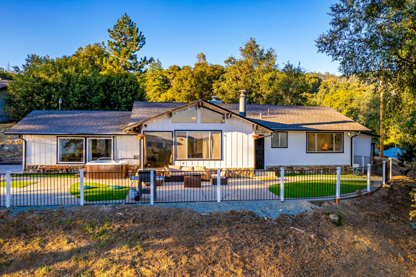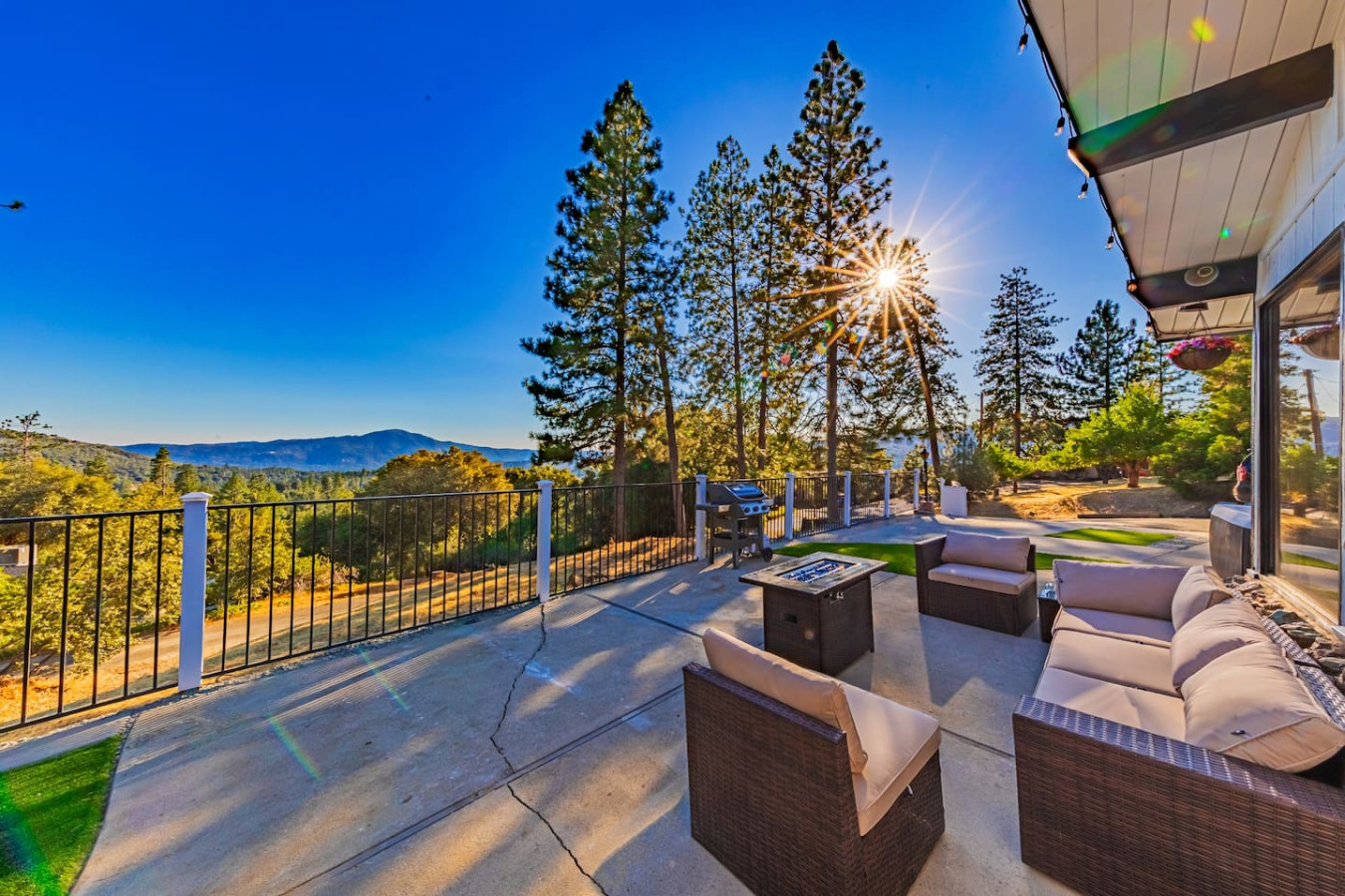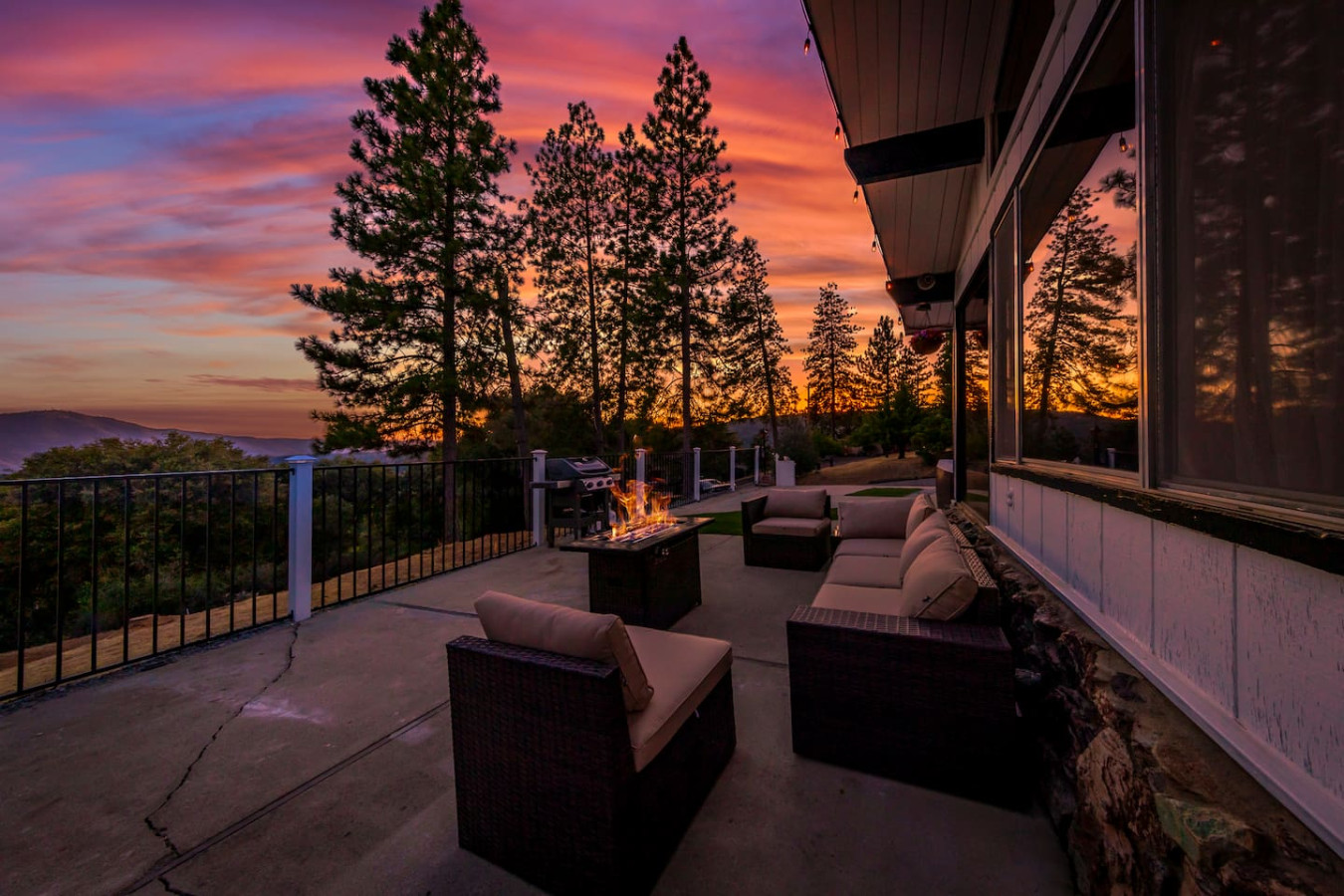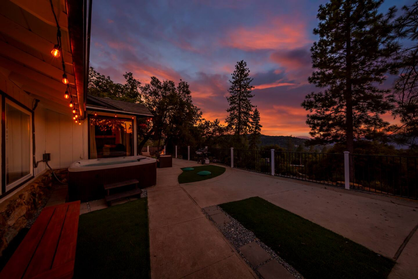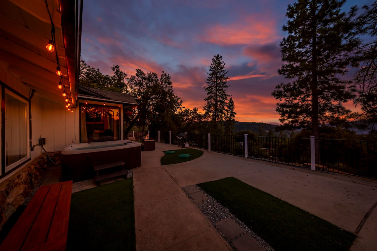 Enjoy high sierras and fresh smell of pines above the snow line in this picturesque and spacious cabin, only 12 miles from the Yosemite South Entrance. Relish views of mountains and night sky right from your living room. Relax with the whole family at this peaceful hilltop terrace with lots of sitting areas, a brand new Hot tub, Fire-pit, BBQ, and a separate in-law unit with dedicated workspace, and a beautiful back porch with rock outcropping. Features a new game room with pool table and views. Newly listed in High Sierra Sky Ranch neighborhood at 3300 ft from sea level, house sits on a hilltop only 2 minutes off Highway 41. Easy access in and out of with paved roads all the way to the driveway. 8 min drive to Bass Lake, and only 12 miles on Highway 41 from Yosemite South Gate. The mountain home features a panoramic view of mountains on either side of the house. Comes with recently renovated rooms, a brand-new Kitchen, and completely renovated Bathrooms. Each room has been carefully decorated keeping your long-term vacation stays in mind, stocked, and sanitized. The house is only 15 min away from Yosemite South Gate. No reservation is required if you leave the house on or before 4:40 AM in the morning, or after 3:45 PM in the afternoon.