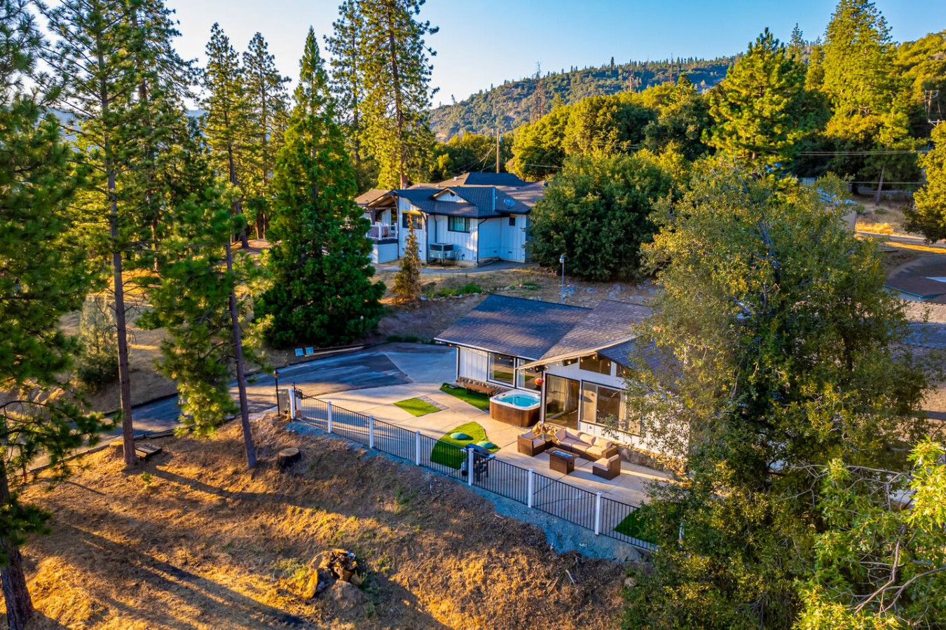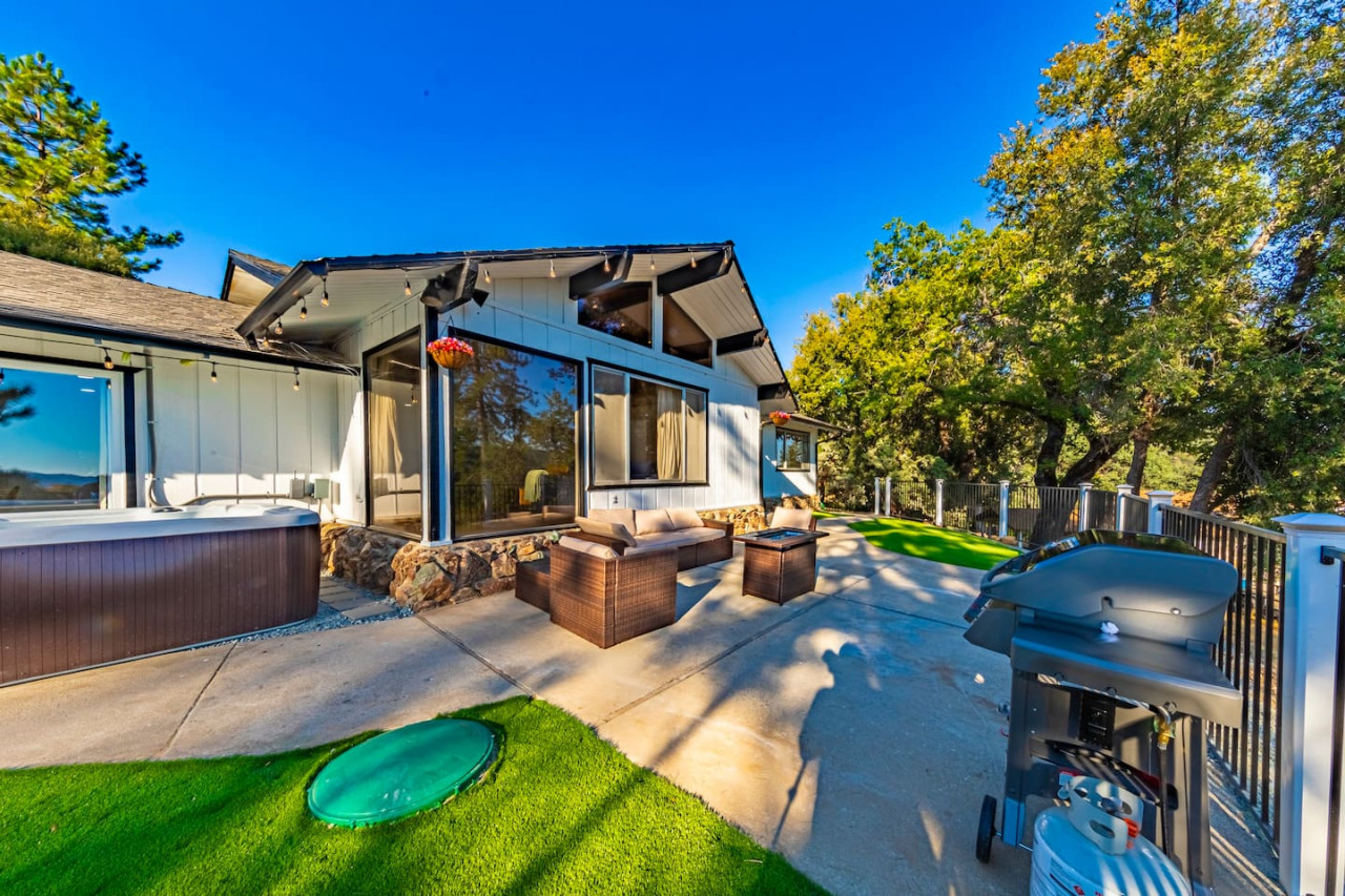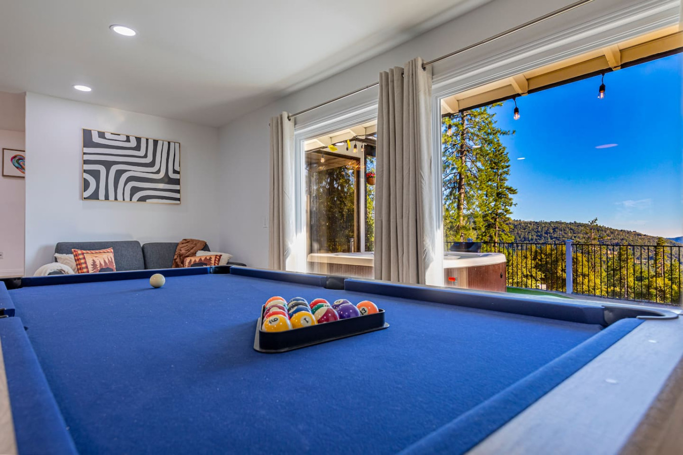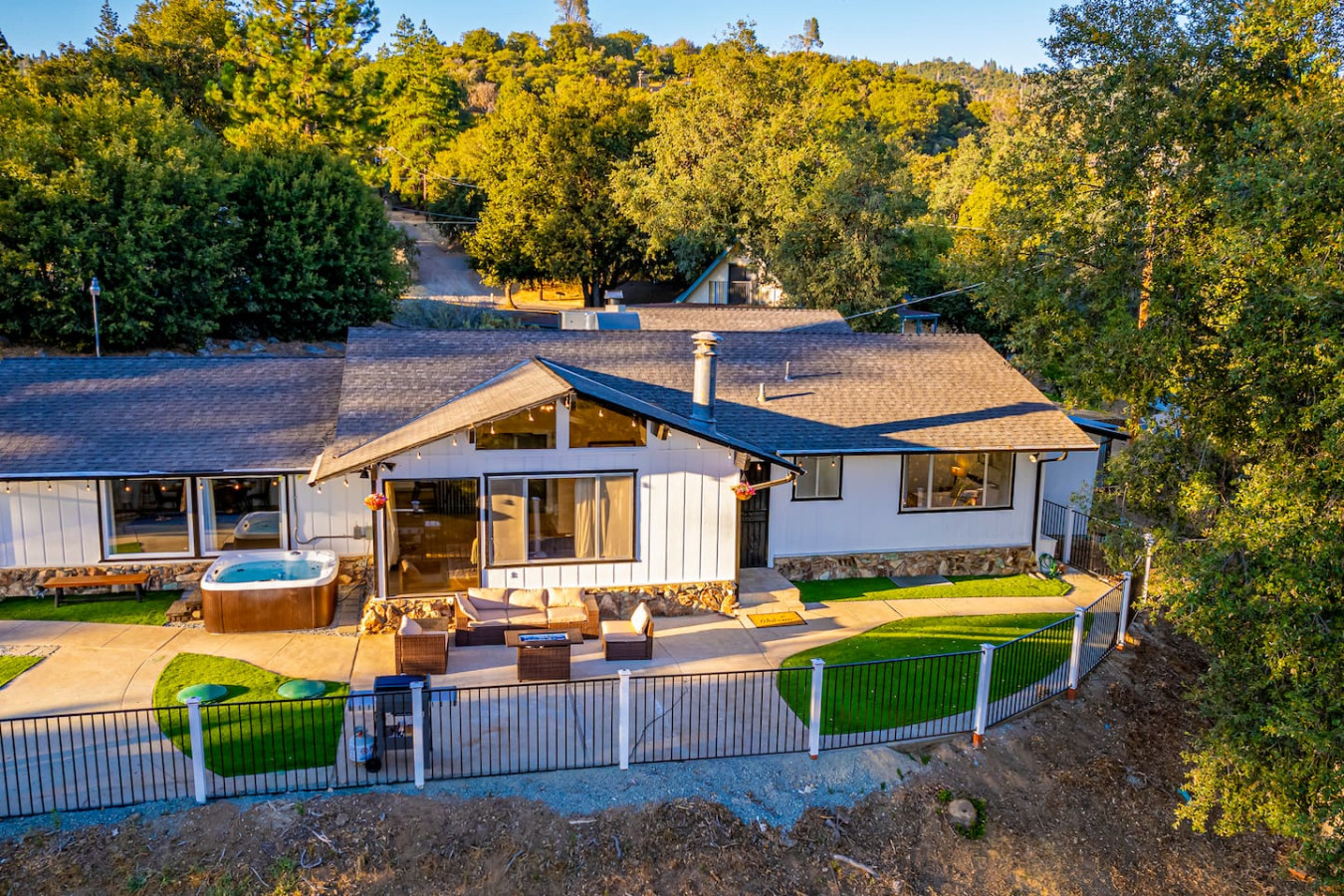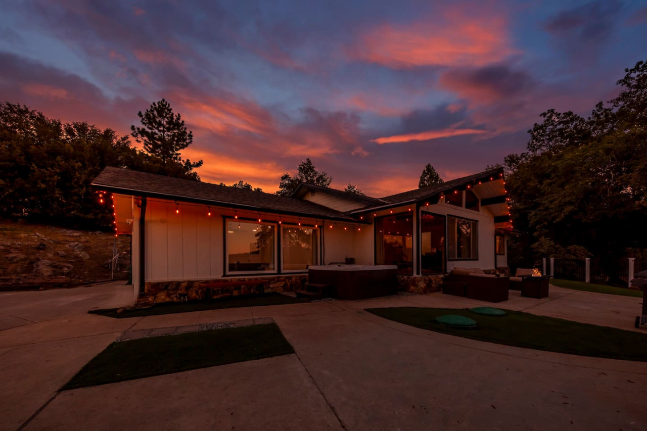 Enjoy high sierras and fresh smell of pines above the snow line in this picturesque and spacious cabin, only 12 miles from the Yosemite South Entrance. Relish views of mountains and night sky right from your living room. Relax with the whole family at this peaceful hilltop terrace with lots of sitting areas, a brand new Hot tub, Fire-pit, BBQ, and a separate in-law unit with dedicated workspace, and a beautiful back porch with rock outcropping. Features a new game room with pool table and views. Newly listed in High Sierra Sky Ranch neighborhood at 3300 ft from sea level, house sits on a hilltop only 2 minutes off Highway 41. Easy access in and out of with paved roads all the way to the driveway. 8 min drive to Bass Lake, and only 12 miles on Highway 41 from Yosemite South Gate. The mountain home features a panoramic view of mountains on either side of the house. Comes with recently renovated rooms, a brand-new Kitchen, and completely renovated Bathrooms. Each room has been carefully decorated keeping your long-term vacation stays in mind, stocked, and sanitized. The house is only 15 min away from Yosemite South Gate. No reservation is required if you leave the house on or before 4:40 AM in the morning, or after 3:45 PM in the afternoon.
