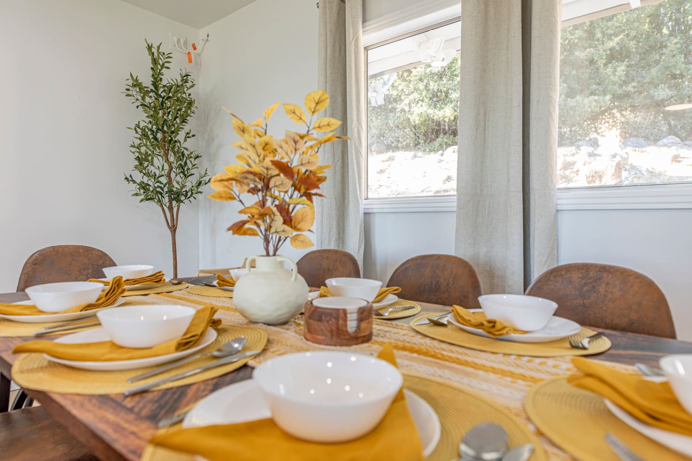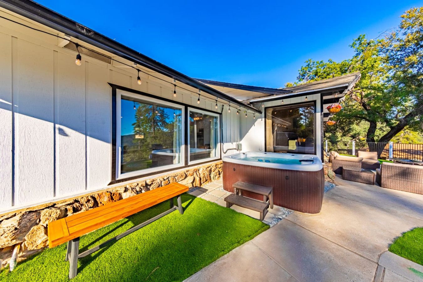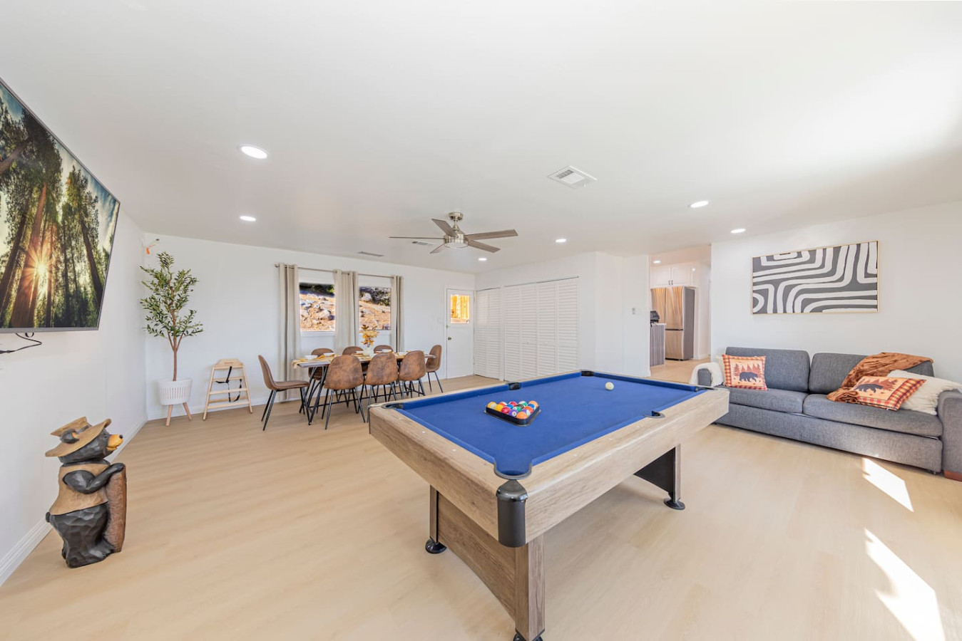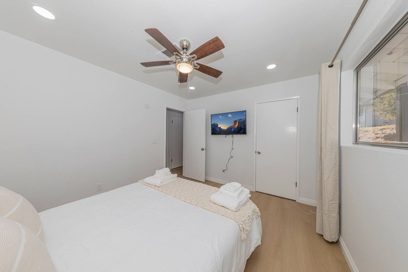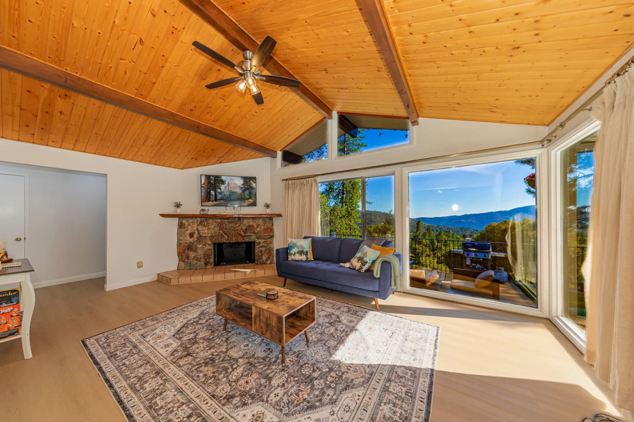 Enjoy high sierras and fresh smell of pines above the snow line in this picturesque and spacious cabin, only 12 miles from the Yosemite South Entrance. Relish views of mountains and night sky right from your living room. Relax with the whole family at this peaceful hilltop terrace with lots of sitting areas, a brand new Hot tub, Fire-pit, BBQ, and a separate in-law unit with dedicated workspace, and a beautiful back porch with rock outcropping. Features a new game room with pool table and views. Newly listed in High Sierra Sky Ranch neighborhood at 3300 ft from sea level, house sits on a hilltop only 2 minutes off Highway 41. Easy access in and out of with paved roads all the way to the driveway. 8 min drive to Bass Lake, and only 12 miles on Highway 41 from Yosemite South Gate. The mountain home features a panoramic view of mountains on either side of the house. Comes with recently renovated rooms, a brand-new Kitchen, and completely renovated Bathrooms. Each room has been carefully decorated keeping your long-term vacation stays in mind, stocked, and sanitized. The house is only 15 min away from Yosemite South Gate. No reservation is required if you leave the house on or before 4:40 AM in the morning, or after 3:45 PM in the afternoon.