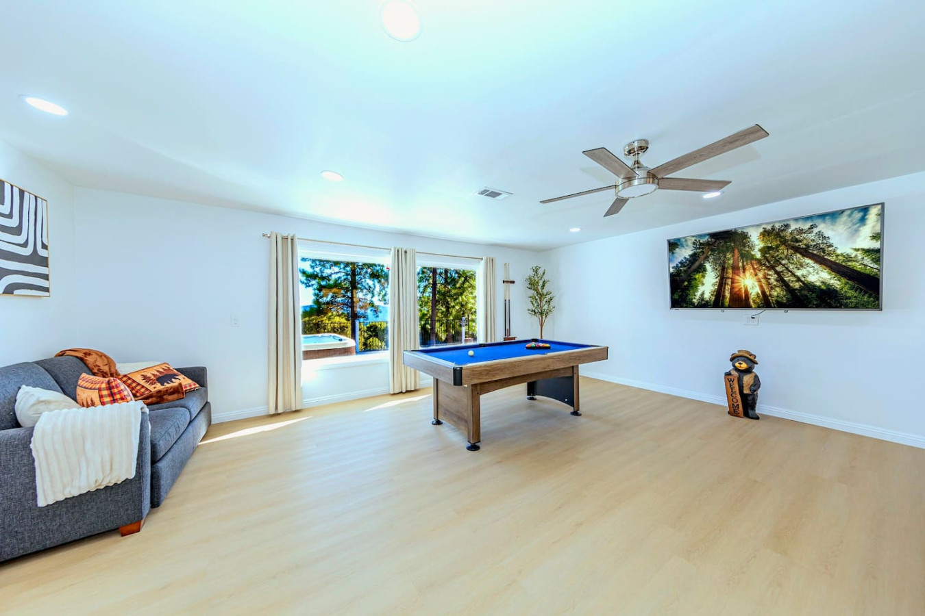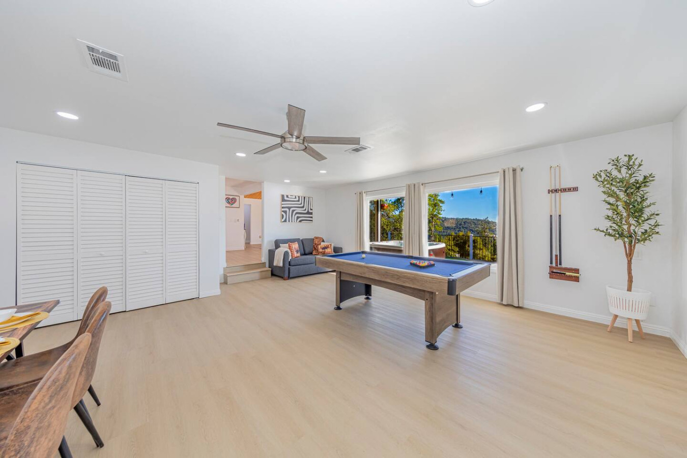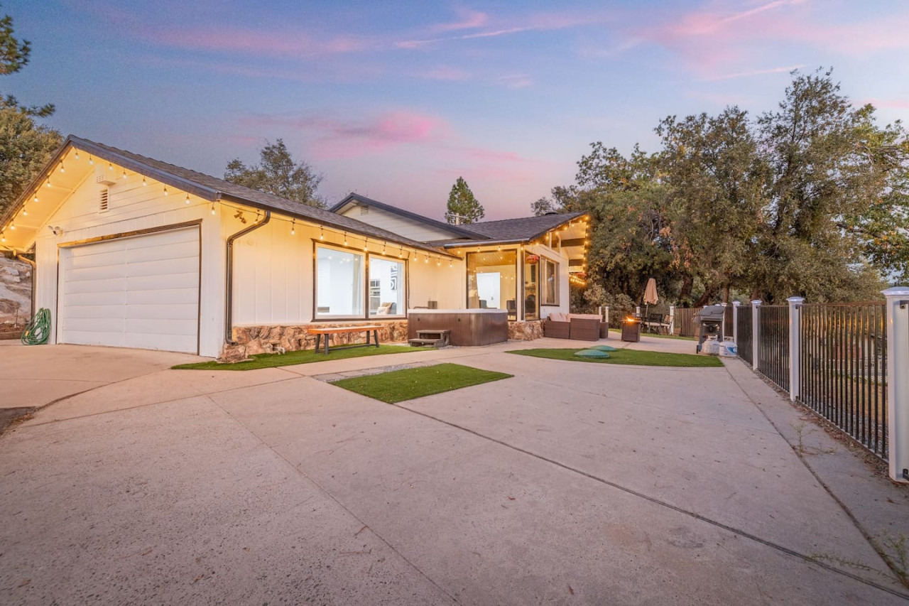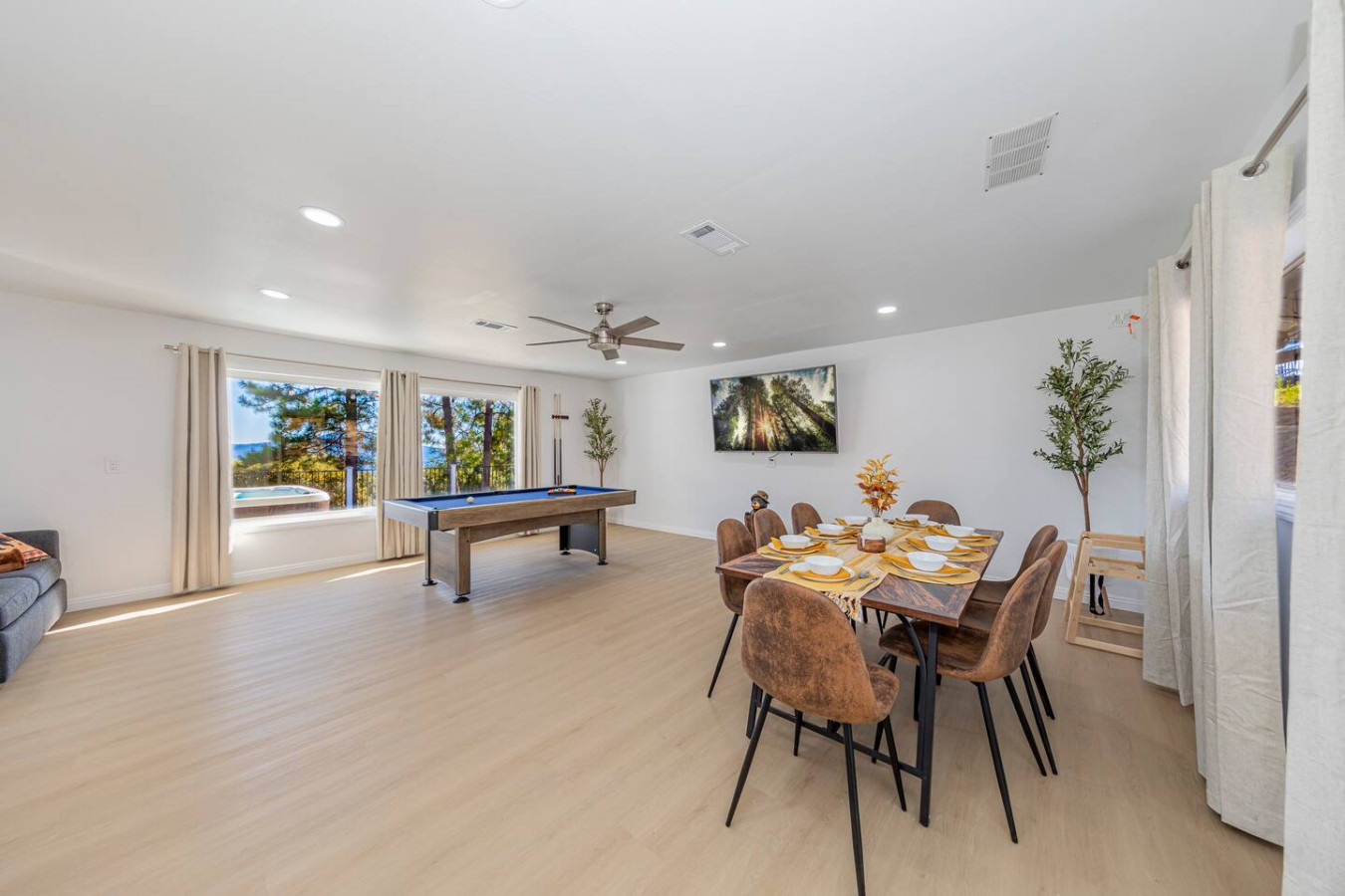 Welcome to the picturesque hillside home located in the majestic high Sierra Sky Ranch neighbourhood at 3300 ft from sea level. Relish views of mountains from the living room and beautiful sunsets, starry night from the house terrace. Enjoy with friends and family at the outdoor seating areas, a brand new Hot tub, Fire-pit, BBQ, a separate in-law bedroomunit with dedicated workspace, and a beautiful back porch with rock outcropping. Features a new game room with a pool table and views. Wholesome space for the entire family to spread out and enjoy a vacation in Mountains. HOME DETAILS Living Room Game Room + Dining Room 4 Bedrooms Kitchen 2 Bathrooms BEDROOMS Bedroom 1: King bed (sleeps 2) Bedroom 2: Queen bed (sleeps 2) Bedroom 3: Queen bed (sleeps 2) Game Room: Pull-out sofa-queen bed (sleeps 2) INDOOR ENTERTAINMENT Living room with Beautiful Views Pool table Board Games 4 smart TVs OUTDOOR ENTERTAINMENT Breathtaking Mountain Views Hottub BBQ Grill Lounge set with Firepit Dining set with shade KITCHEN All cooking essentials: pots, pans , dishes, silverware, bowls, plates, cups, glasses All appliances: refrigerator, freezer, cooking range, oven, microwave, dishwasher Additional appliances: keurig coffee machine, toaster, kettle, blender, rice cooker AMENITIES Fresh Towels Hand soap, lotion Shampoo, conditioner, body wash. Hair dryer Dish/Laundry Detergent Iron, Iron Board TEMPERATURE Central AC and heating Ceiling fans Guests have access to the whole house, except the (labelled) Owner's closet, Houskeeping Closet, and the Detached In-law bedroom. The In-law unit can be requested separately via guest portal, for additional sleeping of upto 4 people. It is equipped with its own AC/Heating, a dedicated workspace, and Smart TV, with room darkening shades. House is managed and monitored round the clock by Sugar Pines Property Management.